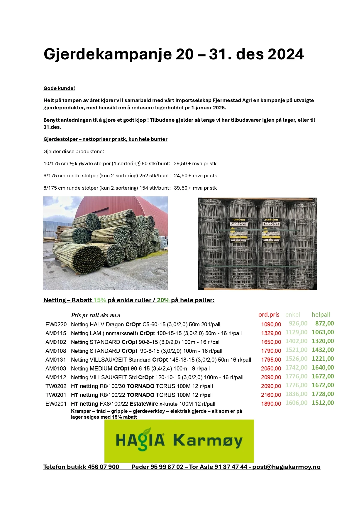 På tampen av året legger vi ut en kampanje på gjerdematriell vi har på lager. Har du planer om nye gjerdeprosjekter før neste sesong, er dette en glimrende anledning til å gjøre et godt kjøp. Prisene er å forstå som hentet på Bøneset og gjelder så lenge vi har produktene på lager, eller til nyttårsaften. Så vær rask med bestilling på mail post@hagiakarmoy.no eller torasle@hagiakarmoy.no