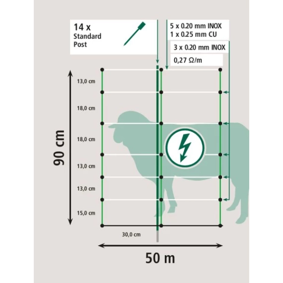 Høyde: 90 cm (7 horisontale polytråder) eller 108 cm (8 horisontale polytråder), hver tilgjengelig med enkelt- eller dobbeltspiss