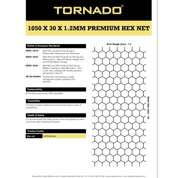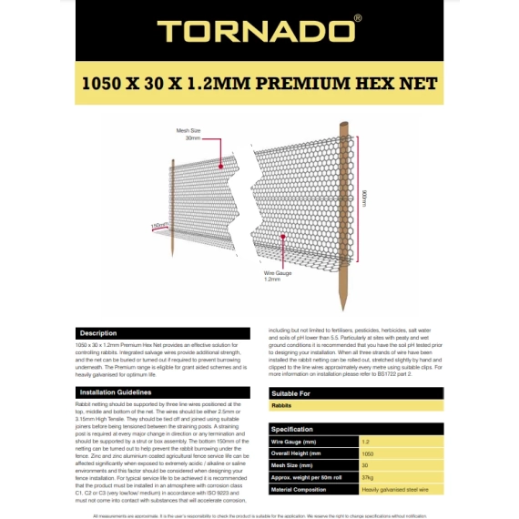 1050 x 30 x 1,2 mm Premium Hex Net egner seg meget godt til inngjerding av kaniner og andre små dyr.. Integrerte kanttråder gir ekstra styrke, og nettet kan begraves eller brettes ut om nødvendig for å forhindre graving under. Tornados Premium-serie er