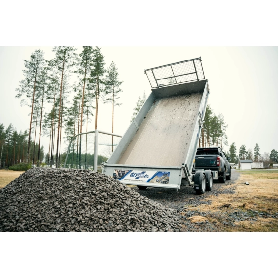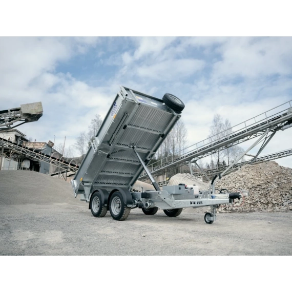 Med en innvendig lengde på 362 cm og en bredde på 195 cm, tilbyr denne tipphengeren betydelig plass til dine varer eller utstyr. Bygget på to aksler og utstyrt med 13" hjul som standard, sikrer den stabil og pålitelig ytelse under transport.