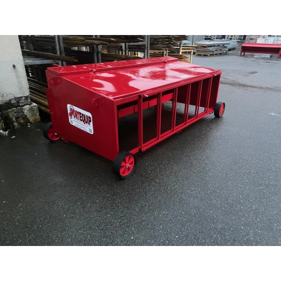 Flyttbar meget solid kraftforautomat til lam. Meget godt egnet til villsaulam eller andre lam med horn. Kapasitet 200 kg. Leveres med hjul. Kan også leveres med strekkmetallgulv, slik at foringen blir rensligere. Høydejustering på bein og justerbar utmating. Regntett lokk og lett å gjøre rent etter bruk. Vi leverer også "bird kit" som tilleggsutstyr for å hindre fugler i å få tilgang.