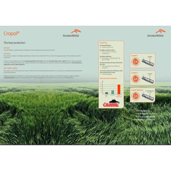 Netting produsert av Crapal®Optimum tråd. Dette er en tråd med zink, aluminium og magnesium som har dokumentert 5 ganger lengre levetid enn vanlig galvanisert tråd. Den er produsert med tvinneknuter ihht standardkrav med